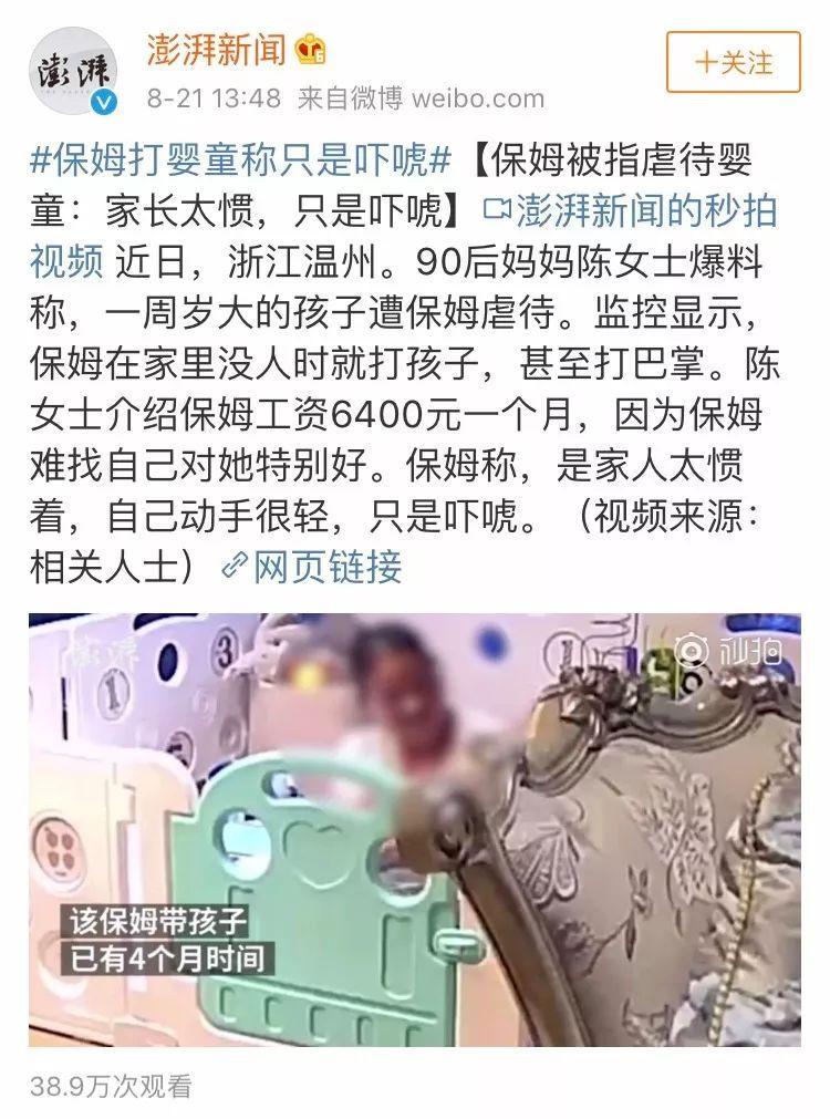 同样是前几天发生在温州的相似事件,妈妈在监控中发现保姆有打孩子的行为,而保姆给出的解释是“都是家长太惯着了,只是吓唬吓唬。”