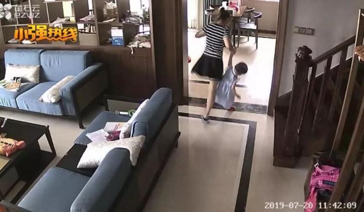 今年7月20日中午11点36分左右,保姆独自跑到楼上,孩子紧随其后。大约6分钟后,保姆带着孩子下楼。最后几个台阶,保姆拎住孩子一只胳膊,几乎是将孩子扔了下来。