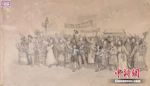 展览展出的第二套人民币5元票正面中心铅笔素描稿——各民族人民大团结景。央美供图