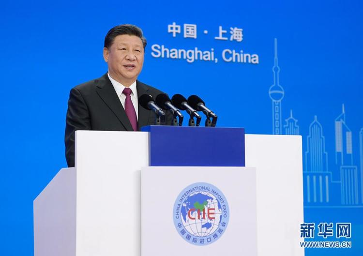 2018年11月5日,习近平在上海出席首届中国国际进口博览会开幕式并发表题为《共建创新包容的开放型世界经济》的主旨演讲。新华社记者 李学仁 摄