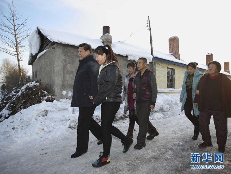 2014年1月26日,农历马年春节即将到来之际,习近平冒着零下30多摄氏度的严寒,来到内蒙古兴安盟阿尔山市伊尔施镇,看望慰问74岁的困难林业职工郭永财一家。 新华社记者 兰红光 摄