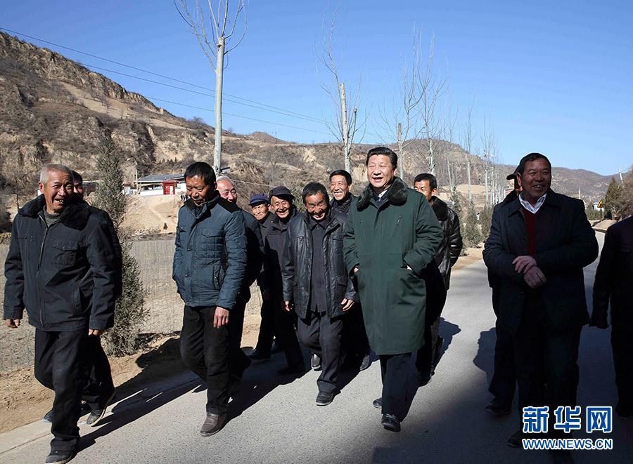 2015年2月13日,农历羊年春节来临之际,习近平在陕西延安市延川县文安驿镇梁家河村调研时同村民边走边聊。新华社记者 兰红光 摄