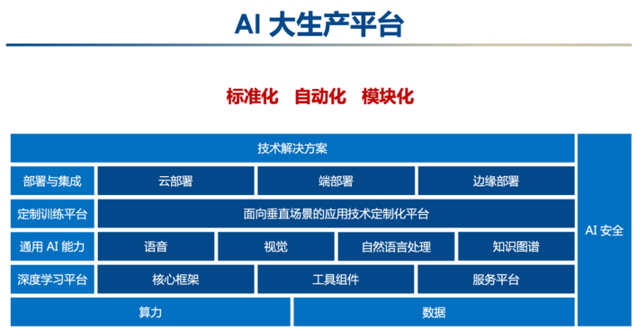 什么是“软硬一体AI大生产平台”?王海峰介绍,在基础算力和数据的支撑下,百度大脑以飞桨深度学习 平台为基础技术底座,打通了人工智能产业化应用落地相关的全部流程,包括深度学习 平台、通用AI能力、定制化训练平台、部署与集成,以及应用的技术解决方案,同时有完整的AI安全体系保障,实现了AI技术的标准化、自动化、模块化。
