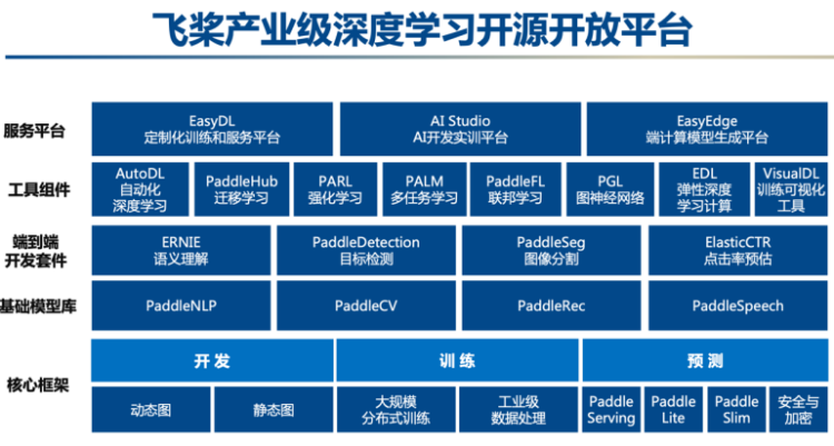 底层的芯片和上层的应用之间,还需要操作系统承接。在智能时代,深度学习框架向下对接硬件、芯片,向上承接各种业务模型、行业应用,起到承上启下的作用,是“智能时代的操作系统”。百度自主可控的飞桨深度学习 平台,集深度学习训练和预测框架、模型库、开发套件、工具组件和服务平台等为一体,是功能完备、全面开源开放的产业级深度学习 平台。飞桨平台核心技术领先,具备开发便捷的产业级深度学习框架、超大规模深度学习模型训练技术、多端多平台部署的高性能推理引擎、开源开放覆盖多领域的产业级模型库四大领先技术。
