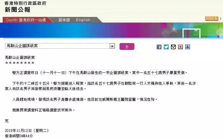 香港特区政府12日零时44分发布新闻公报,称警方正调查这宗企图谋杀案 。