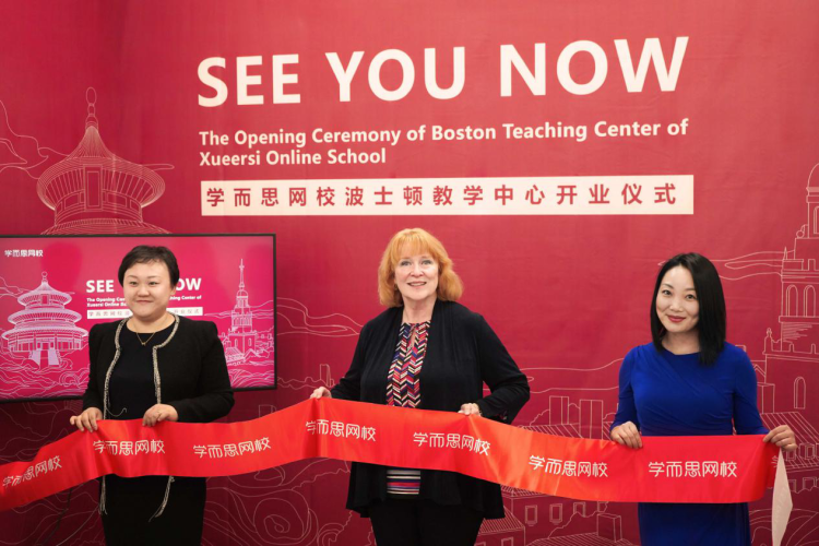 美国东部时间10月9日上午,好未来旗下学而思网校波士顿教学中心正式开业,哈佛大学就业办公室Mary Frazier-Davis女士(以下简称“Mary女士”)、好未来集团美国首席投资官陈丁鸿、学而思网校副总经理郝月菲共同为开业仪式主持剪彩,多家海外媒体到场见证。