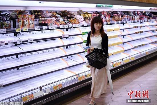 面对风暴来袭,日本民众几天前就开始采购电池和防灾用品。日本各地多家超市更是出现人们忙着囤积食物和日用品的景象。图为日本超市被半空的货架。