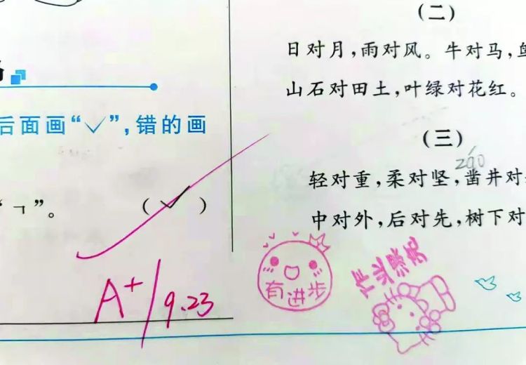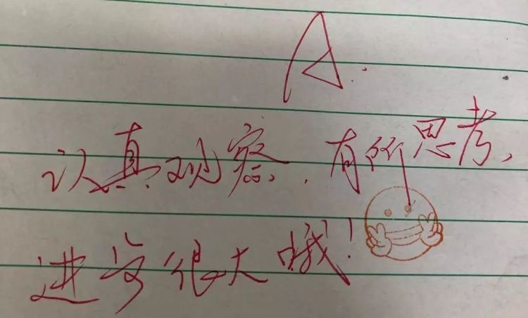 “我从网上下了几套表情包,有时想不出来,就看下手机。都是简笔画,不会占用太多时间。”陈婷婷说,在作业本上画表情,是最近的尝试。她想换种方式跟孩子沟通,让他们对作业有所期待,或许能激发学习热情。同样用画画为作业本“增色”的,还有小学的数学老师余仟懿,数学作业全对且书写漂亮的,不仅可以评为“优”,还能得到老师亲手画的“比心”小人物,配上“棒棒哒”等文字,每一份作业都相当用心。