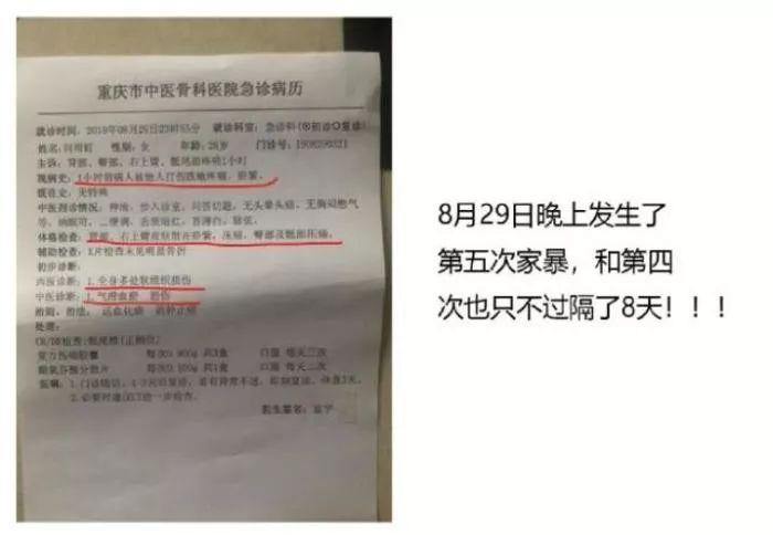 宇芽同时也在微博中晒出第五次家暴的急诊病历。该病历称,患者“被他人打伤跌地疼痛,瘀紫”,诊断为“全身多处软组织损伤”。