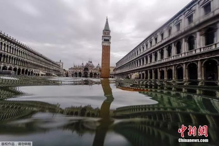2019年11月15日,意大利威尼斯圣马可广场在涨潮时被洪水淹没。
