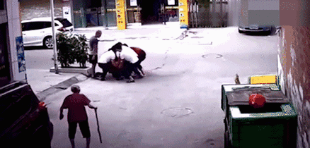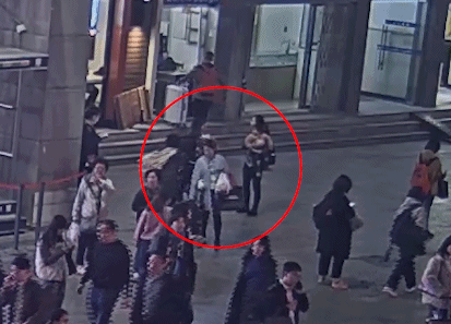 下面三个动图中,人贩子(女)大喊男子(孩子父亲)是人贩子,团伙一拥而上假装正义路人。