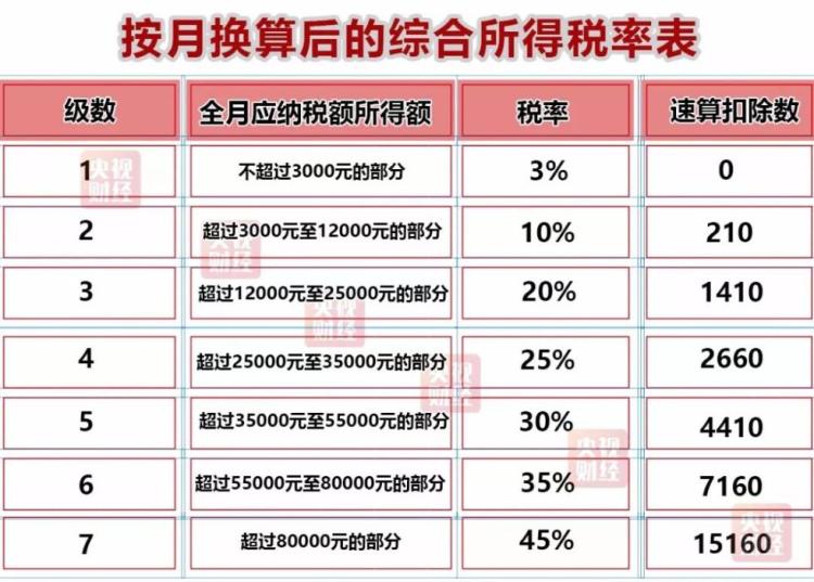 其中,速算扣除数和税率对应全月应纳税所得额,分7个档次。全月应纳税所得额不超过3000元的,税率为3%,速算扣除数为0;超过3000元至12000元的部分,税率为10%,速算扣除数为210;最高的一档,也就是全月应纳税所得额超过80000元的部分,税率为45%,速算扣除数为15160。