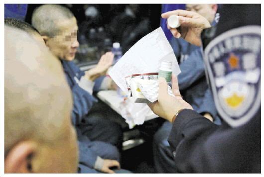 晚饭后不久,随车的医务民警从十几斤重的药箱中拿出患病服刑人员的药物,依次送药入口。