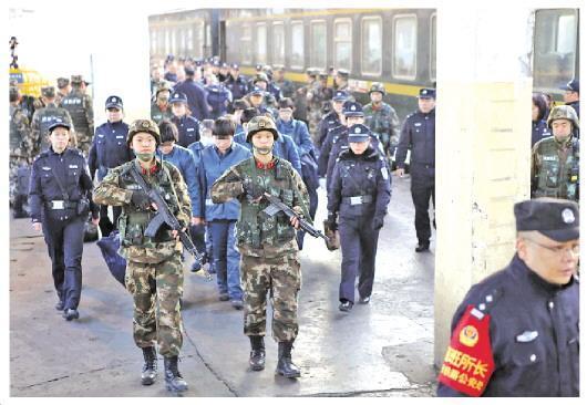 随着列车的准点抵达,站台上陕西省监狱系统民警、武警、铁警等已早早进行了警戒布控。在与陕西当地监狱完成程序交接后,天河监狱的遣送民警们才得以松口气。