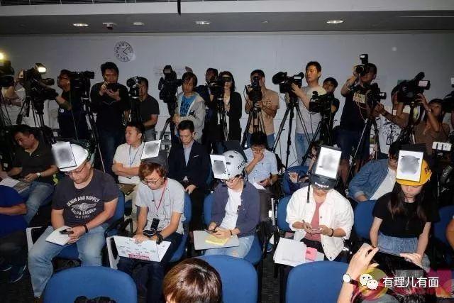 11月4日,香港警方举行的记者会刚开始,有6名记者突然同时戴上写有标语的头盔进行所谓的“抗议”,公然将新闻发布会现场当作示威场所。