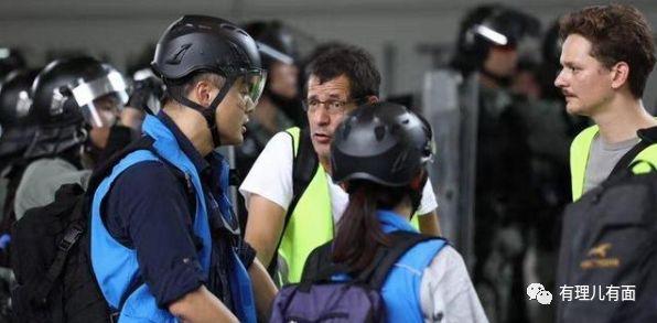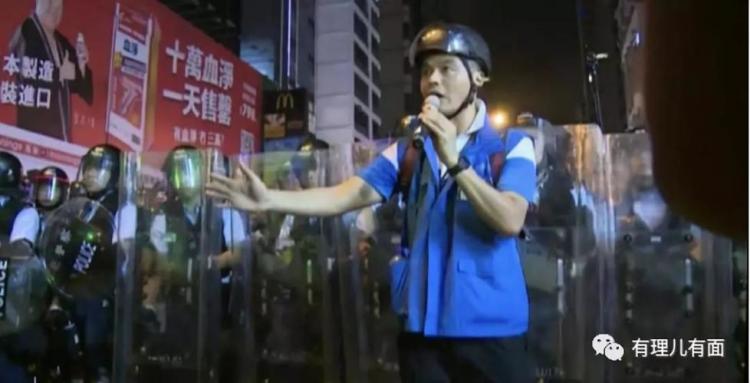 警察公共关系科的警员中,除了镜头前我们熟悉的几位发言人,其实还有一些警员战斗在止暴制乱的第一线。他们穿着单薄的“蓝背心”,手持话筒和扬声器,冒着四处横飞的钢珠和汽油弹在现场穿梭,帮助陷入险境的记者,守护新闻报道的安全线。