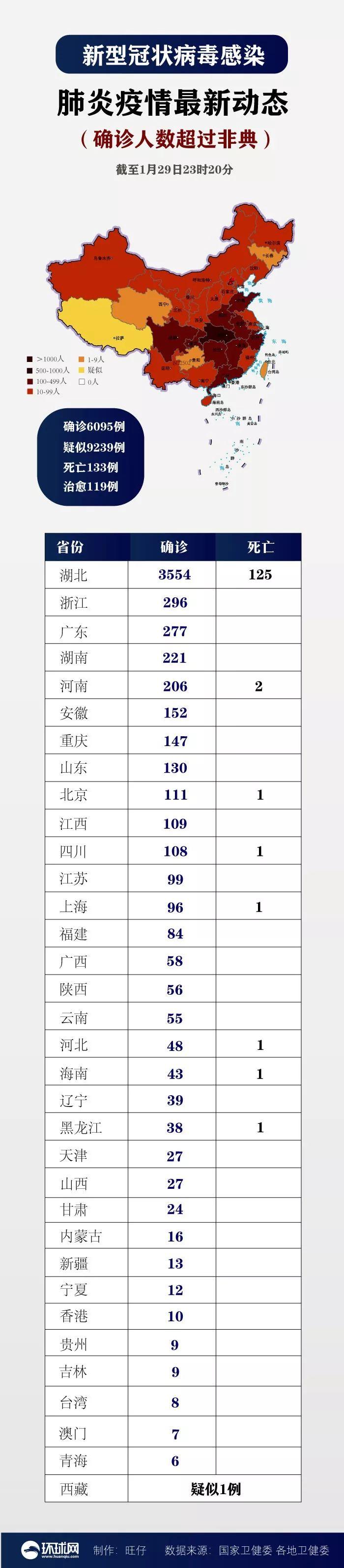 结合国家卫健委和各地卫健委的通报数据,截至29日23时20分,全国已累计确诊新型冠状病毒肺炎6095例,死亡病例133例,治愈119例。