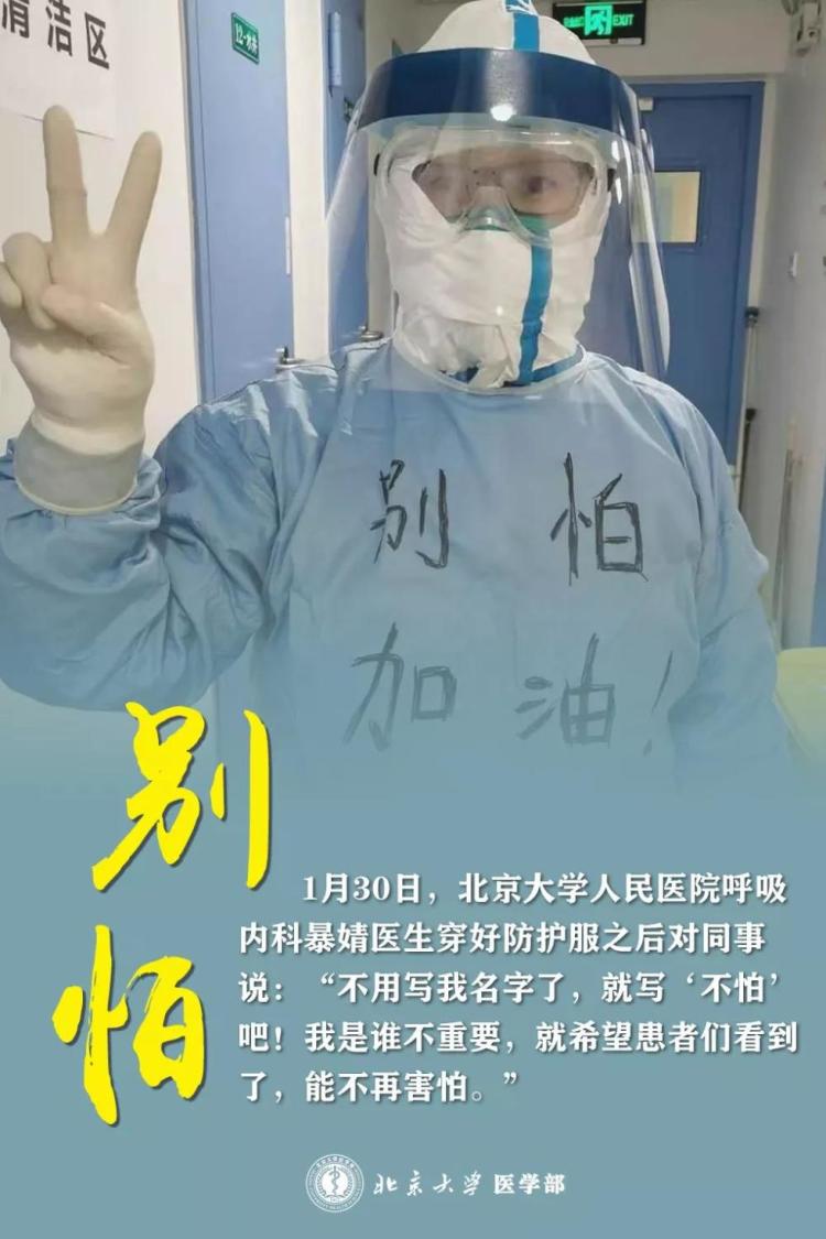 援鄂医疗队员、北京大学人民医院呼吸内科暴婧医生跟大家说:“不用写我名字了,就写‘不怕’吧! 我是谁不重要,就希望患者们看到了,能不再害怕。 ”