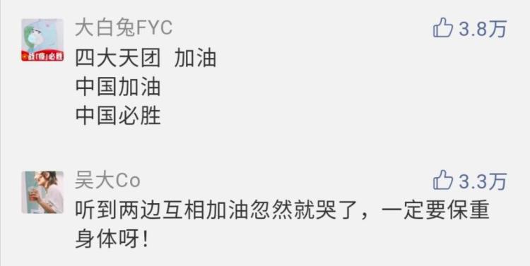 看到中国各地王炸都来了,有网友说,“全村的龙已把最硬的鳞给你,哪怕自己也伤痕累累,所以,武汉,加油!”