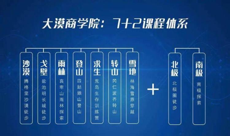 通过腾格里沙漠徒步、四姑娘山登山、冈仁波齐转山、荒岛求生训练营、盐池明长城徒步、雨林探索穿越、林海雪原徒步七个阶段加南北极二个极地训练课程体系,解决企业的短板现象、团队凝聚力不强、战略方向不明确、企业文化不明晰等问题,以提高个人和团队的耐挫折能力、领导能力、协作能力,培养企业家和团队的创业精神、挑战精神、奋斗精神、公益精神等。