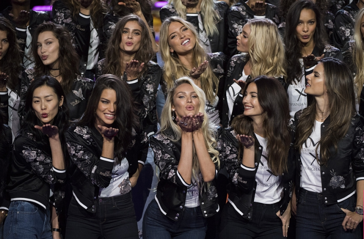 2017年11月18日,上海,维密天使齐聚上海为即将开幕的2017维密大秀拍大合照,中国超模刘雯、奚梦瑶、何穗现身。刘雯眯眼送飞吻,何穗与卡莉·克劳斯(Karlie Kloss)并排凹造型。