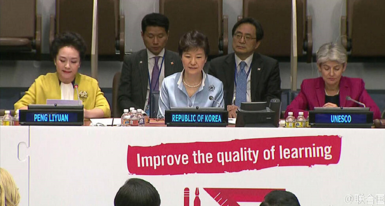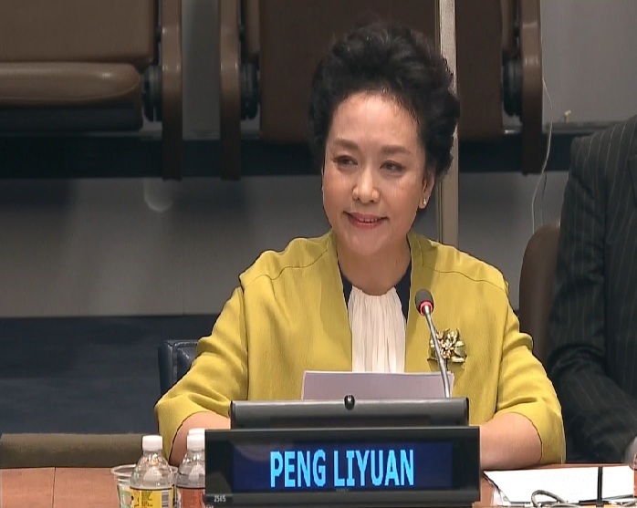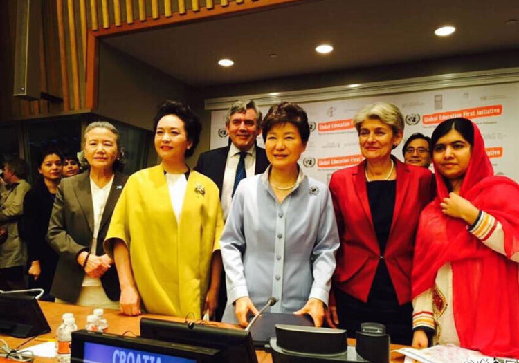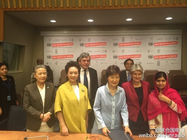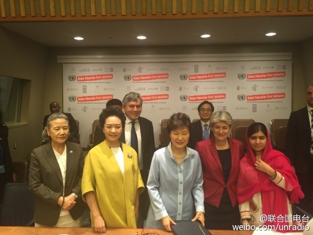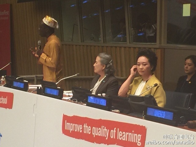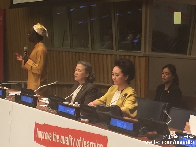 据联合国官微,联合国教科文组织特使彭丽媛正在与秘书长潘基文夫人柳淳泽共同出席全球教育第一倡议高级别活动。彭丽媛全程用英文发言。