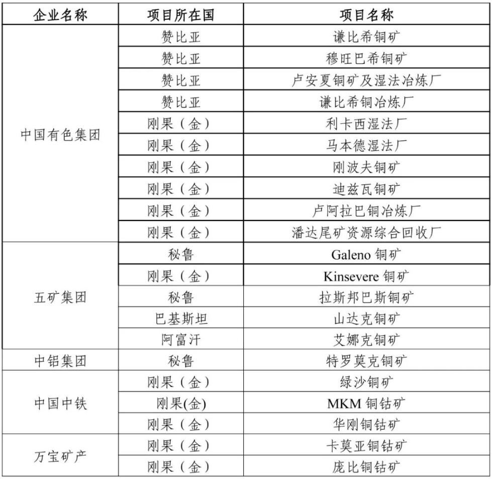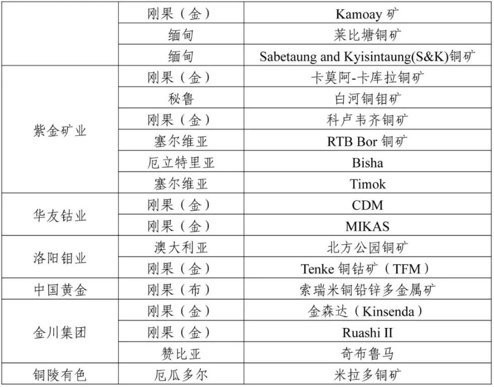 目前,在境外拥有铜资源、在产项目,并形成一定规模的国内企业,主要有中国有色集团、五矿集团、中铝集团、中国中铁、万宝矿产、紫金矿业、华友钴业、洛阳钼业、中国黄金和金川集团等。