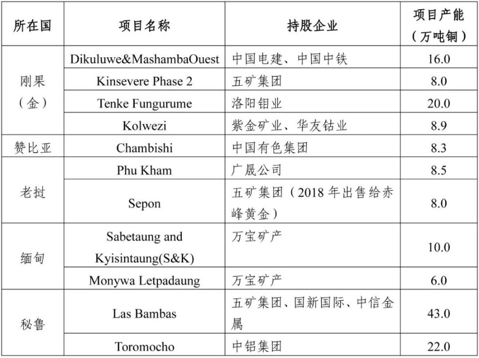 表中产量指我国企业控制的铜产量,而非权益产量。