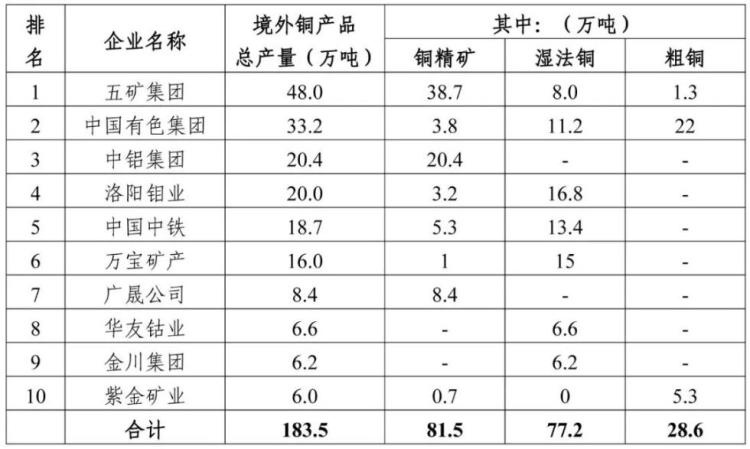 注:1.表中“铜精矿”和“粗铜”产量在“境外铜产品总产量”中不重复统计;2.