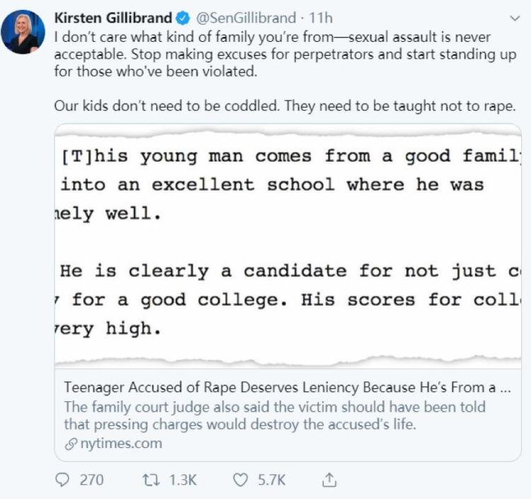 “不管来自什么样的家庭,性侵就是不可被接受的”,美国纽约州的女参议员柯尔斯滕⋅吉利布兰德(Kirsten Gillibrand)在她的个人账号写到,“孩子不应该被娇生惯养,他们应该被教育不要去强奸他人”。