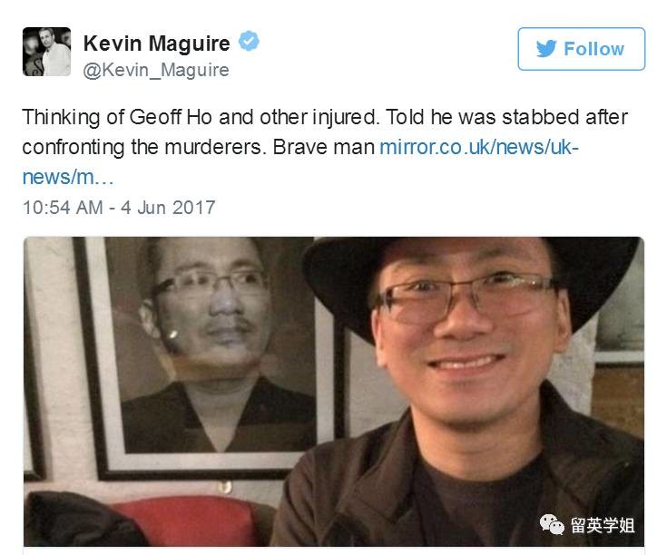 当时,英国华裔记者何杰夫(音译,Geoff Ho)在Southwark街一家酒吧附近,看见歹徒正在合力袭击门卫,有武术功底的何杰夫立即上前与袭击者搏斗,在警察到达前,不仅救了门卫的性命,也为更多的市民争取到了逃命的时间。