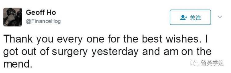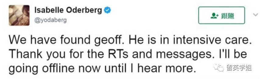 该推文被热心网友迅速转发,几个小时候,欧德柏格再度发文感谢网友称:“找到Geoff了,他进了加护病房,感谢大家的转推和关怀,有进展时我会再更新状况。”
