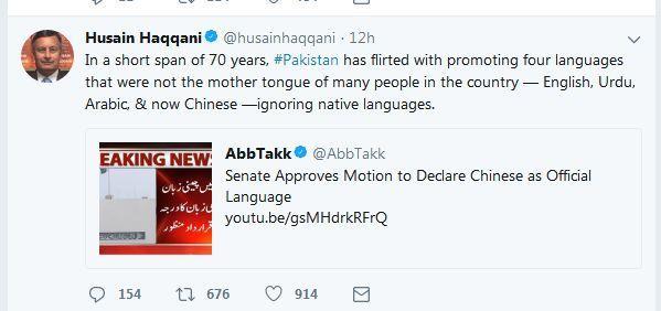 不仅如此,ANI还援引巴基斯坦驻美国大使侯塞因的推特,对将中文设为官方语言表示不满↓
