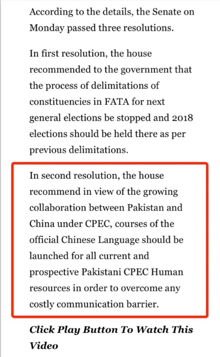 但是这篇报道的内容似乎有自相矛盾的地方。其文章第一段说,参议院周一通过了将汉语作为官方语言之一的提案。但其内文说,巴基斯坦参议院周一通过了三项决议,其中第二项的内容是: