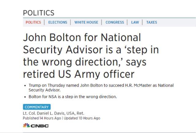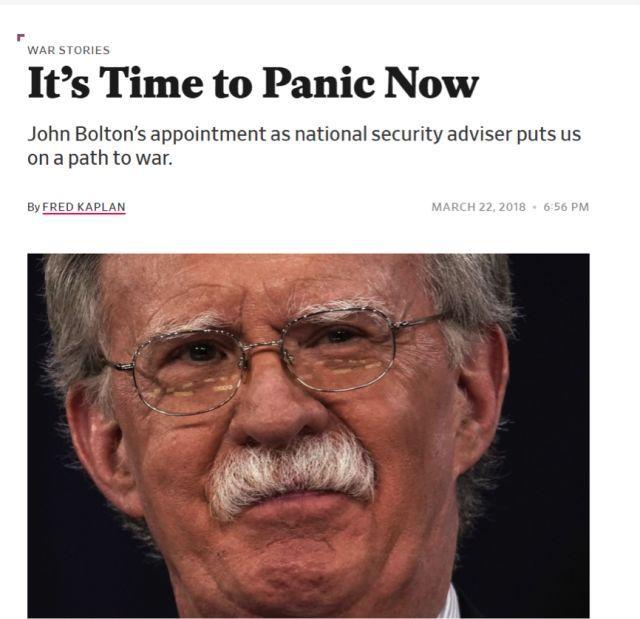这,也恰恰是为啥美国这么多媒体会因为这个博尔顿成为美国总统的新任国家安全顾问而感到强烈的不安和恐慌。他们害怕这个“至今仍认为美国入侵伊拉克没错”的 “极端鹰派”分子会在当前这个极为敏感的国际局势面前,把美国直接推下战争的悬崖!