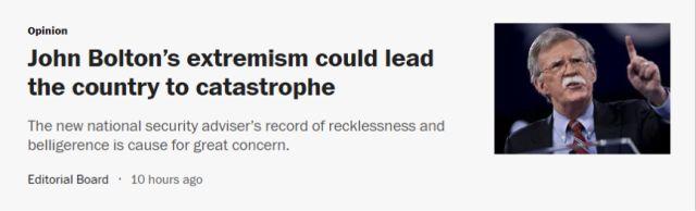 这不,就在几个小时前,美国《华盛顿邮报》已经在该报的社评中明确地写道:“博尔顿的极端思想会让整个美国遭遇空前的灾难!”