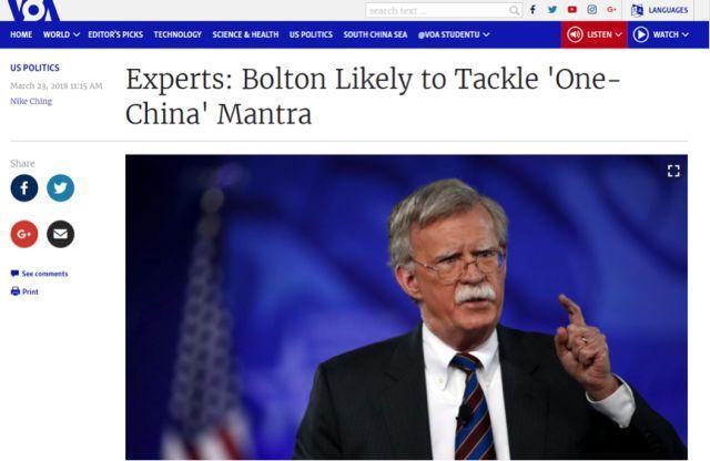 美国政府的官方喉舌“美国之音”也认为博尔顿会建议特朗普调整美国的“一个中国”政策。