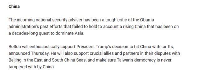 其中在对华问题上,这家媒体认为博尔顿除了会坚定支持特朗普对中国打贸易战,也一定会在南海问题上鼓动美国的盟友一起对中国发难,并会尽全力“捍卫”台湾不被中国统一。