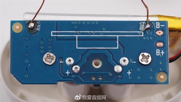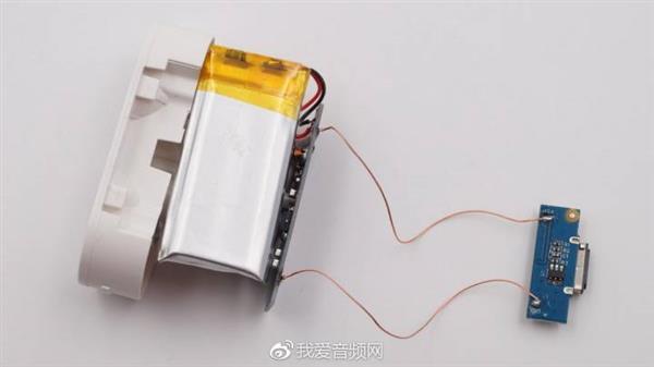 第二,电池居然没有固定,直接放置在扬声器和外壳之间,电池有晃动空间,不慎摔落,电池边角受到挤压;另外拆解的这个电池,正负极还在外面,完全有可能和扬声器接触短路,boom。