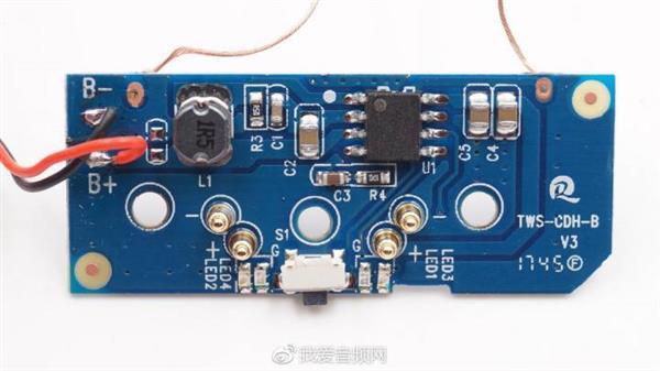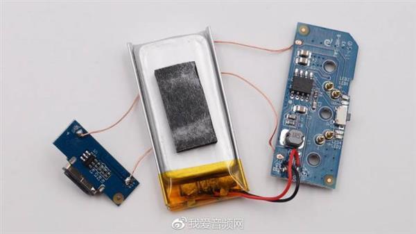 分离下电池,能看到两块PCBA的详细做工。其中左侧电路板上有一颗SOT23-6封装的小芯片;右侧电路板起到移动电源功能,主要由SOP8芯片搭配单电感和外围电路控制,输入可以为电池充电,输出则为耳机供电,相当于耳机专用充电宝。
