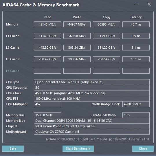 当XMP DDR4 3000MHz频率时,内存读取、写入、复制进一步提升至42146 MB/s、44987 MB/s、38595 MB/s,而延迟时间降低至48.7ns。