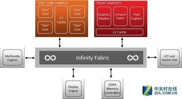 APU作为CPU和GPU的结合体,它的GPU部分与普通显卡没什么区别,但是APU的显卡有个缺点,就是它没有显存 ,它的末端直接连接上了北桥(见下图),所以APU想发挥性能必须占用内存。