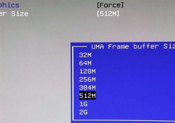 同样的,我们需要进入主板BIOS中,在高级中找到“Graphics Configuration”,其中UMA Frame buffer size就是显存设置,将其容量调成1GB-2GB比较合适。